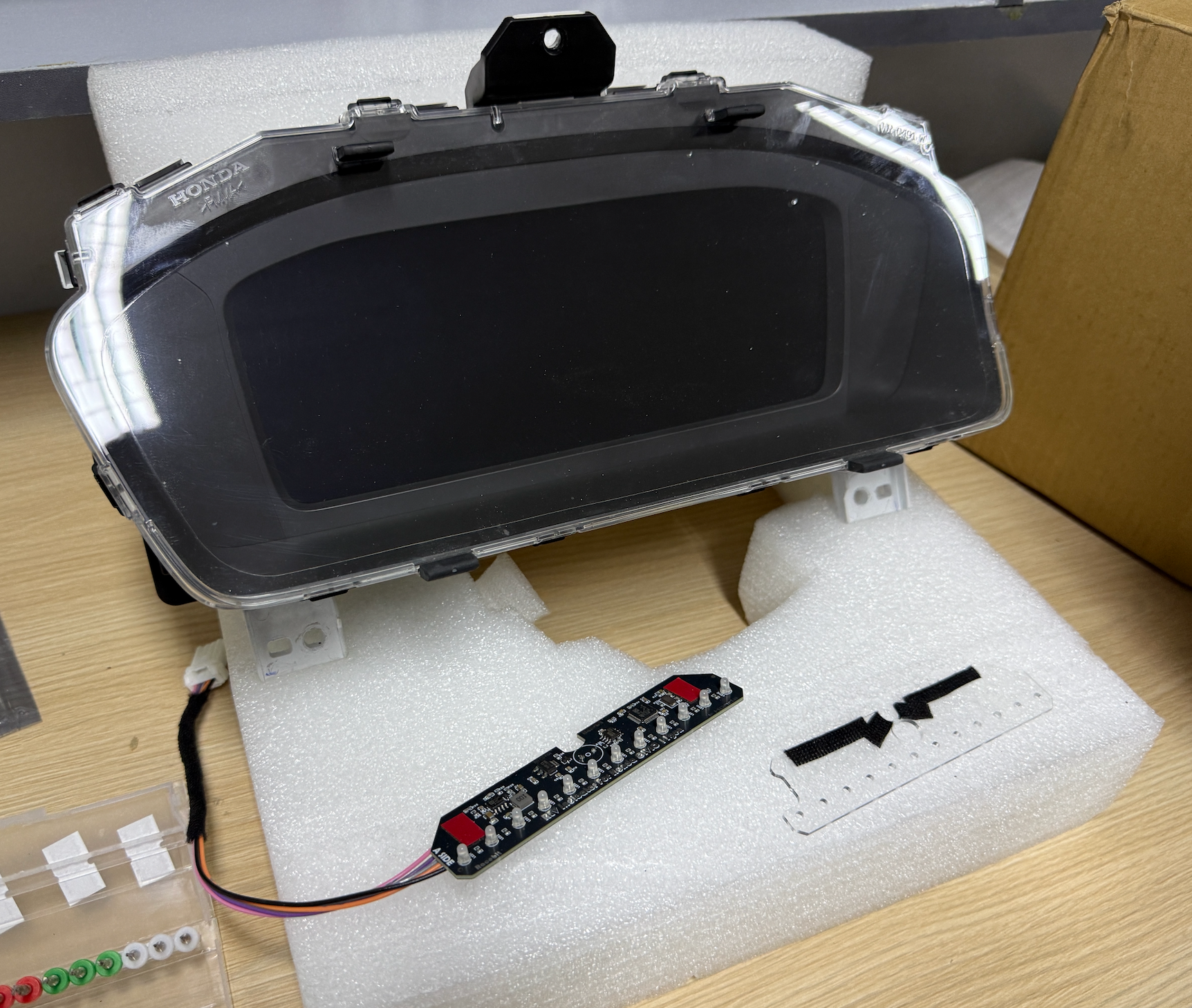 • To install the LED lights, you need to open the instrument cluster, drill 12 holes  using the acrylic template guide together with our high precision drill bit.